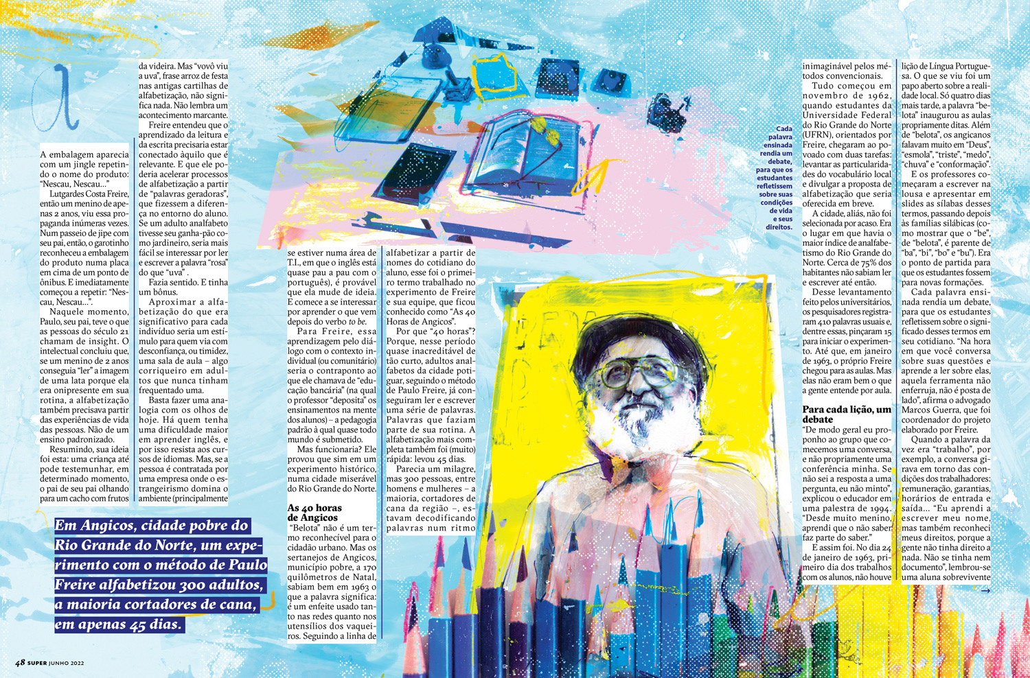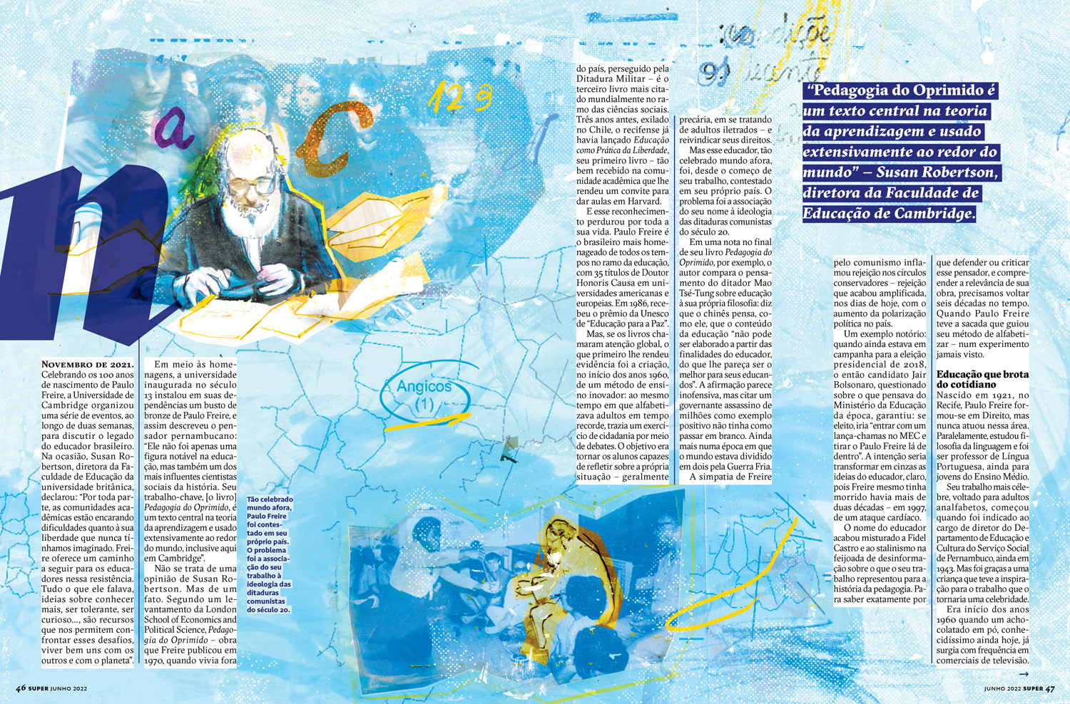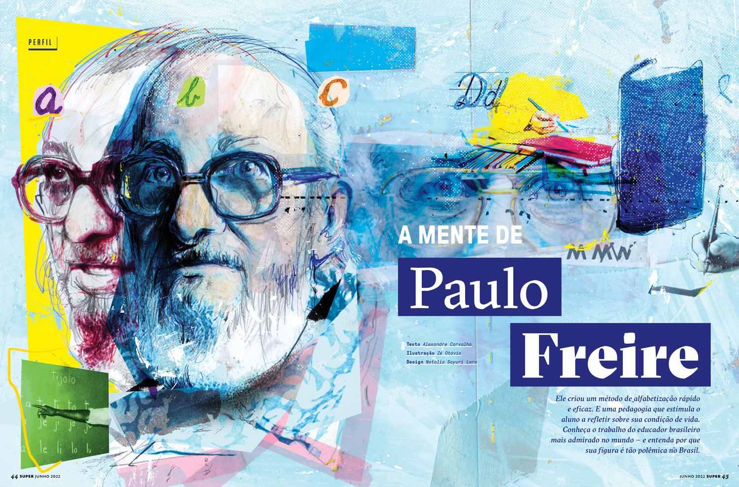 Portrait of the Master Paulo Freire for Superinteressante Magazine. Paulo Freire was a Brazilian educator and philosopher who was a leading advocate of critical pedagogy. The article is called “The mind of Paulo Freire: Paulo created an effective literacy method, a pedagogy that encourages the student to reflect on life, understanding why your figure is so controversial.”