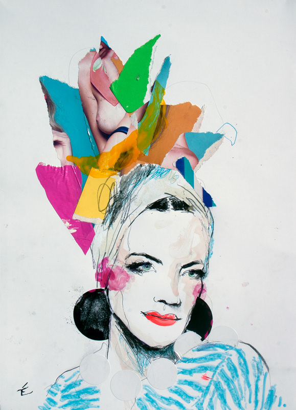 wheatpaste on wood finished with mixed media (acrylic, pen, pencil, polish nail, collage)