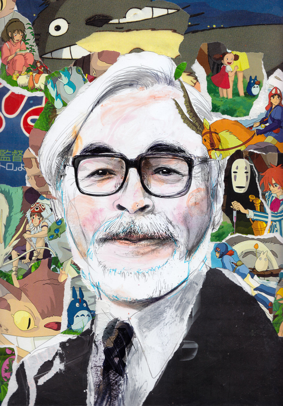 portrait of the Japanese animator, filmmaker, screenwriter, cartoonist, author, and manga artist, Hayao Miyazaki for an ongoing series called "Violent Dreams"